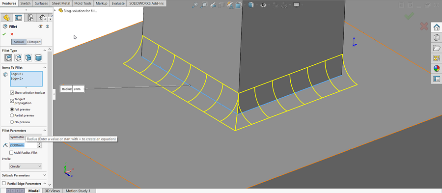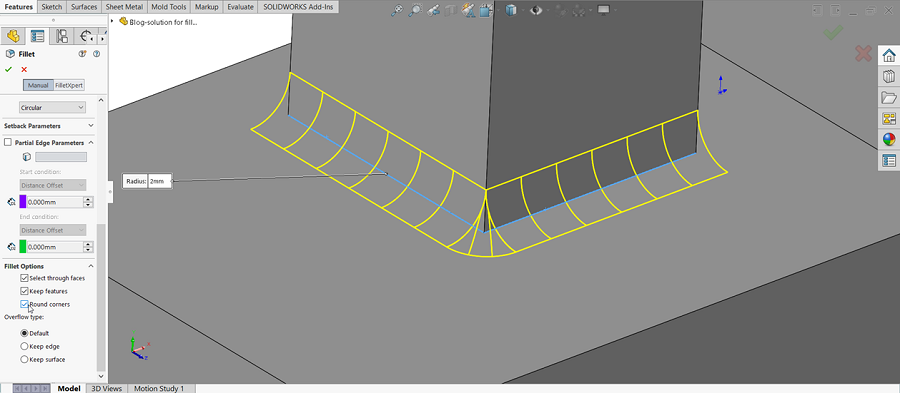 During my last Advanced Part Modeling Online class, we learned about a setting that controls how SOLIDWORKS solves fillets when filleting two edges that meet at a corner. The default solve extends the fillet faces to intersection at the corner.